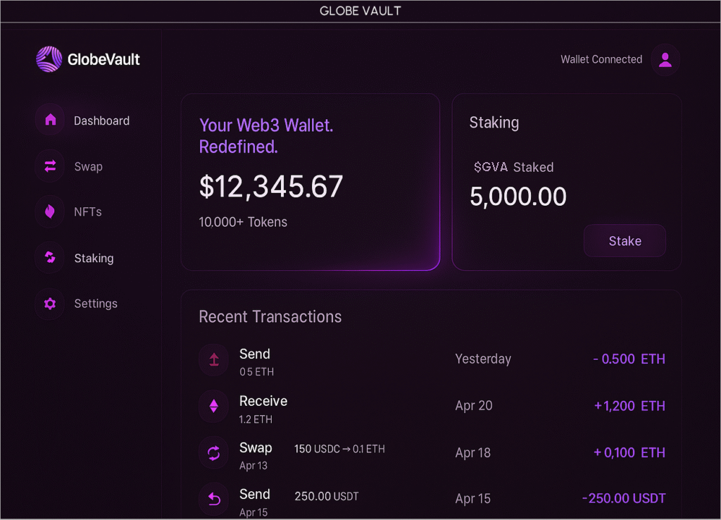 Unlike basic wallets, GlobeVault combines portfolio tracking, swapping, staking, and multi-chain support — all in one sleek, non-custodial platform.